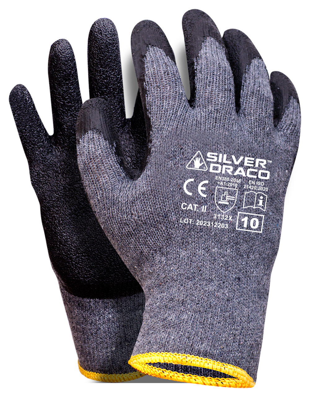 Super Silver Draco er en klassisk brolæggerhandske. Strikket i bomuld, hvilket gør den åndbar og behagelig at have på, selv efter en hel arbejdsdag. Derudover er den belagt med en kraftig ru latexbelægning i håndfladen, som gør at den får en meget høj slidstyrke. Kombinationen af bomuldsstrik og latex gør desuden at denne handske sidder tæt på hånden, så man stadig kan mærke hvad man arbejder med.