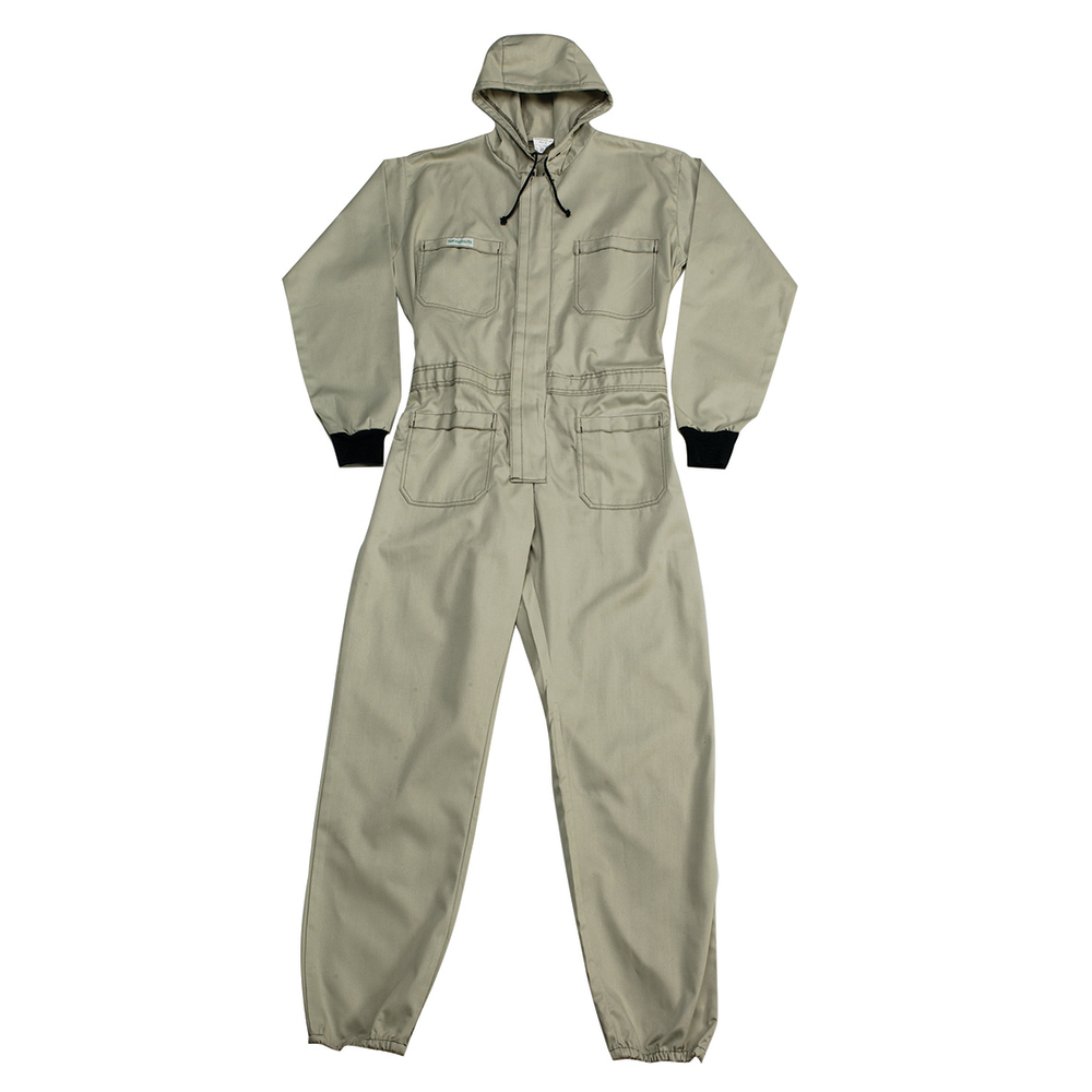 Dragt i støvtæt kvalitet med elastik ved ankler samt ribmanchet ved håndled. Dragten har hætte med snøre og 4 frontlommer med klap. Skjult lynlås i front. Bruges blandt andet til sandblæsning og lakering. Lys kaki materiale fremstillet af tætvævet polyester og bomuld. Bemærk, at dragten ikke kan anvendes som beskyttelsesdragt mod væsker og kemikalier.